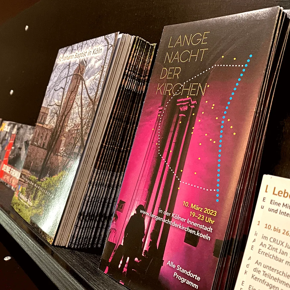 The spectrum of projects for the 26 inner-city parishes in Cologne‘s city centre ranges from design, communication and marketing for special events, exhibition design and guidance systems, workshops for employees and community representatives to strategic advice for the most famous church in the world, the Cologne Cathedral.